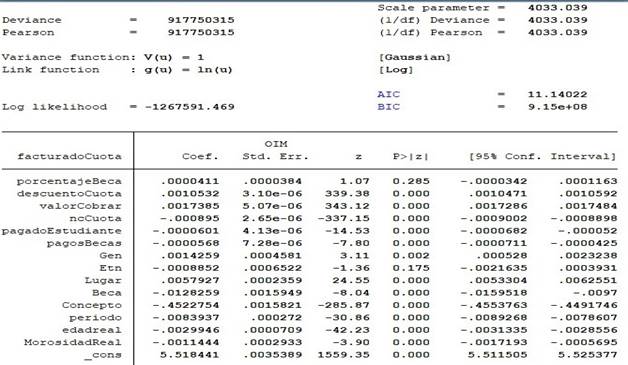 Como variables independientes se categoriza en dos grupos económicos y socio gráficos, tales como: número de cuota, concepto de pago, valor pagado, descuentos, beca, porcentaje de beca, género, etnia, edad, periodo de estudios, valor pendiente de pago. Después de la modelación respectiva se omitieron dos variables que tenían multicolinealidad, valor efectivo a cobrar y valores pendientes y se definió el modelo con mejor predicción que facilite observar los efectos sobre el presupuesto.