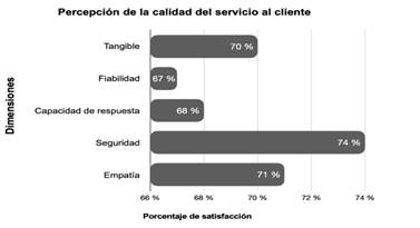 A continuación, se detalla la percepción de calidad del servicio al cliente En la figura dos se describe el porcentaje de satisfacción del cliente con respecto a cada una de las dimensiones, destacando la dimensión de seguridad, así, se evidencia un aspecto positivo para la imagen de la banca pública de la ciudad de Azogues, ya que el cliente disfruta de un ambiente seguro en donde realizar sus transacciones, sin embargo, no está demás fortalecer esta dimensión.
