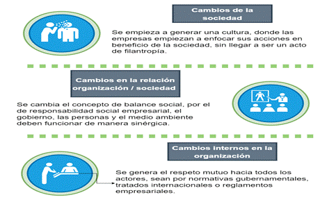 Como se observa en la figura 1, las empresas al implementar manuales de RSE generan cambios en la sociedad, estos son una evolución donde las empresas dejan de ser cheques en blanco para regalías o proyectos vacíos y pasan a ser un trabajo social elaborado y enfocado, los cambios entre la relación organización/sociedad, generan distintas etapas donde todos los stakeholders deben trabajar de forma conjunta, la empresa y la subsistencia del medio ambiente. Los cambios internos en la organización deben generar el clima adecuado de trabajo, fomentando la libre organización de empleados, respetando las luchas sociales alcanzadas.