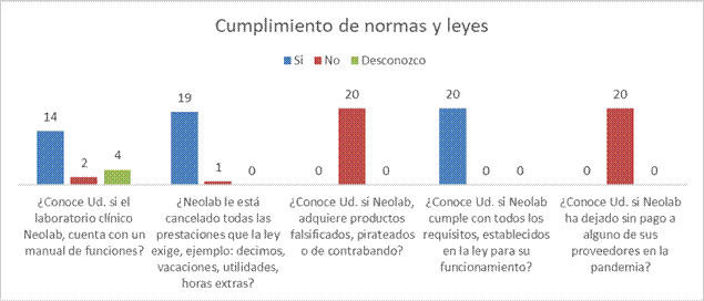 En similitud al cumplimiento del manual de funciones y operaciones, Neolab, se basa en los criterios de los estudios antes mencionados. Neolab se encuentra muy bien posicionado, esto debido a que su líder ha sabido involucrar a casi el total de personal en cuanto al uso del manual de funciones, y mantener a la ética como aliado principal, esto debido a que, en los laboratorios clínicos, la información de los pacientes se maneja de manera confidencial, al igual que en la ejecución de los exámenes clínicos, estos se mantienen bajo estrictos parámetros de calidad, criterios aceptados por Correa (2007) y (Bestratén & Pujol, 2003).