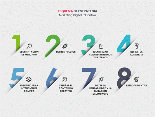 Con la presente investigación se procura desarrollar una estrategia innovadora de marketing digital educativo, por lo tanto, se planteó un esquema enfocado en 8 procesos secuenciales, los cuales servirán para potenciar los resultados eficientes en la aplicación de campañas de productos y servicios educativos, los cuales son: