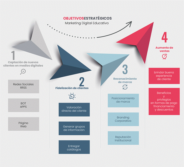 Se plantea 4 objetivos estratégicos para la aplicación de Marketing digital educativo: