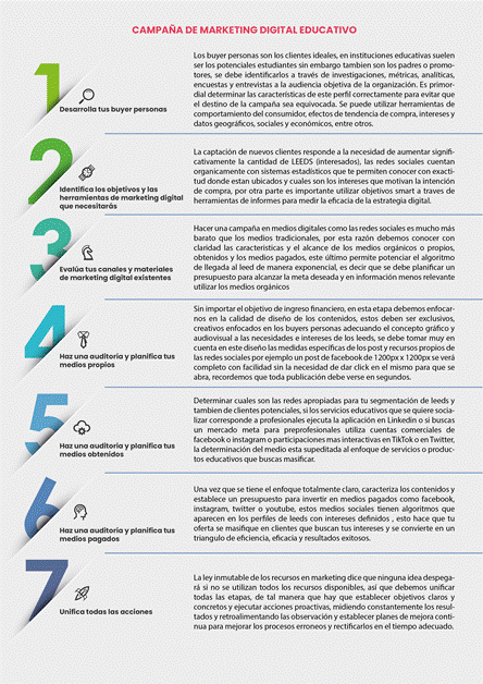 El diseño de una campaña innovadora de marketing digital educativo está estructurado en 7 fases sistematizadas en torno a un enfoque del producto en cuanto a la calidad del contenido y a la determinación del Buyer persona (cliente potencial y objetivo) leeds y la efectividad del manejo de medios digitales.