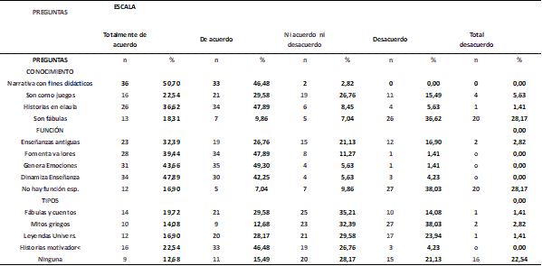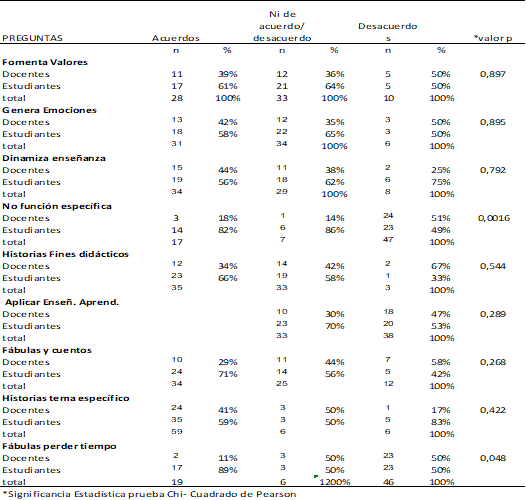 Al analizar de manera independiente las preguntas más votadas según docentes y estudiantes, se pudo apreciar que para los docentes lo relevante fue un conocimiento de la herramienta para dinamizar el proceso de enseñanza, mientras que para los estudiantes la opción “no tiene función específica” fue lo más relevante, seguido de “son fábulas y cuentos”. Las únicas respuestas que tuvieron significancia estadística respecto del conocimiento de la herramienta fueron “no tiene función específica” y “son fábulas para perder el tiempo” pero esta última con una prevalencia mayor en la opción desacuerdos.