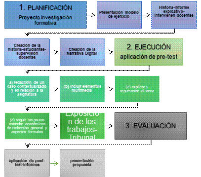 Ejecución: la aplicación de la herramienta como estrategia didáctica se realizará en fases debidamente coordinadas y socializadas con autoridades, cuerpo docente y estudiantes involucrados, cada una de ellas se presentará debidamente explícita indicando la secuencia que se fundamenta en la contextualización de la historia, utilizar elementos multimedia, argumentación y presentación de la historia, y la exposición de la temática utilizando la herramienta propuesta.