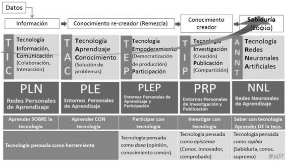 En el mismo sentido algunas de las nuevas competencias que los docentes deben desarrollar son el manejo de las redes personales de aprendizaje íntimamente relacionadas con las TIC; Entornos personales de aprendizaje orientadas alas TAC; Entornos personales de aprendizaje y participación direccionados por las TEP; Entornos personales de participación y publicación regidos por las Tecnologías para la investigación y publicación [TIP] y finalmente adentrarse en las redes neuronales de aprendizaje que han surgido con la ayuda de la inteligencia artificial.