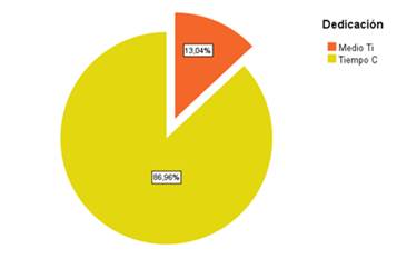 Dedicación. En lo que respecta a la dedicación, el gráfico 2 muestra que el 86,96% del total de docentes tienen dedicación de tiempo completo, y tan solo el 13,04% son docentes a medio tiempo. En lo que respecta a tiempos parciales, la muestra tomada al azar no considera a ningún docente.