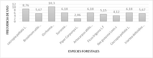Los datos etnobotánicos recolectados en el estudio propuesto, proporcionaron la información para el desarrollo de la propuesta, además permitió conocer a la comunidad y los recursos tan valiosos que poseen. En la comunidad se identificaron 10 especies forestales que fueron las seleccionadas para los análisis respectivos, todo ello, mediante encuestas a los pobladores de la comunidad.