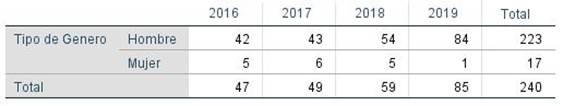 La tabla 1, evidencia el tipo de género y año donde se cometió el homicidio, evienciandose que los hombres han padecido mayor número de homicidios.