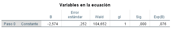 El valor de la constante fue de -2,574, sin incluir variables predictoras, existiendo posibilidad que el valor varíe al ser incorporadas tales variables.
