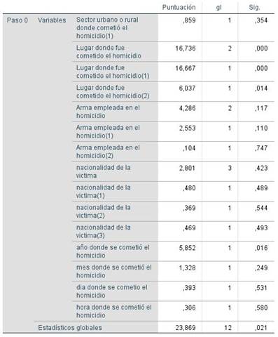 El paso 7 indica un valor de Wald de 9,284 y significancia de 0,002 para la variable lugar donde fue cometido el homicidio (1), indicándose con 1 para la alternativa “vía pública”, con un valor para Exp(B) de 0,08, por lo que el modelo predice que las personas tienen una probabilidad de 0,08 de sufrir un homicidio en la vía pública, en comparación a otro lugar donde se encuentren.