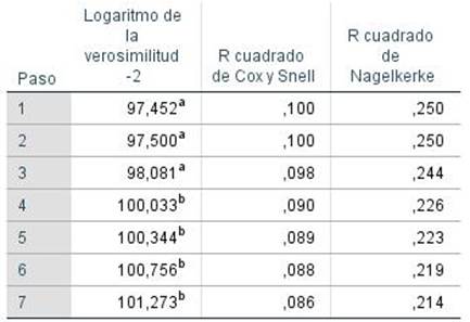 El r cuadrado de Nagelkerke indica que el modelo en el paso 7 explica el 21,4% de cambio de la variable dependiente.