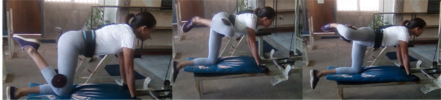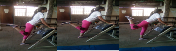 Apóyese en un lugar seguro, con una leve inclinación al frente, coloque la mancuerna tras rodilla como en el ejercicio anterior, al iniciar tense primero el glúteo y luego suba, una vez empezado mantengan la tensión constante sin detenerse en ningún punto.