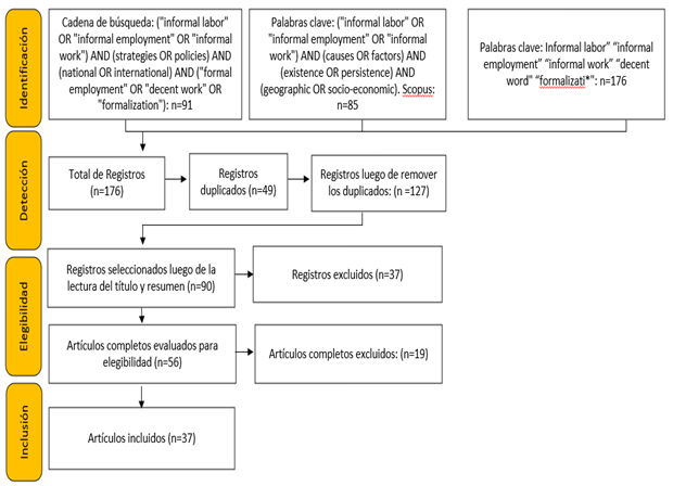 Se realizó la búsqueda en la base de datos de WOS y Scopus tomando en cuenta la siguiente cadena de búsqueda: ("informal labor" OR "informal employment" OR "informal work") AND (strategies OR policies) AND (national OR international) AND ("formal employment" OR "decent work" OR "formalization").