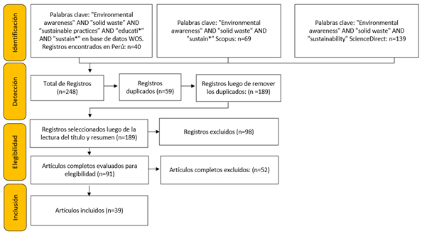 Se realizó la búsqueda en la base de datos de WOS y Scopus tomando en cuenta la siguiente cadena de búsqueda; "environmental awareness" OR "solid waste" AND "sustainable practices" AND "educati*" AND “sustain”. Los resultados además arrojaron las siguientes palabras claves: