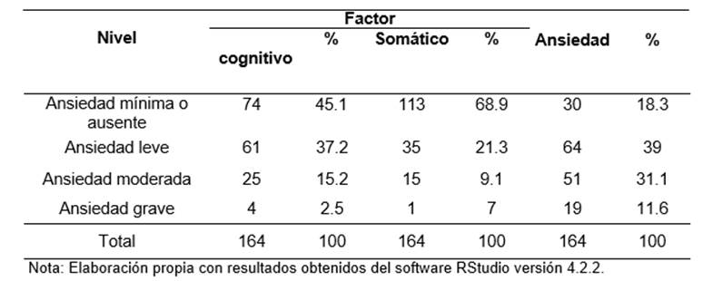 En la tabla 1, existe mayor prevalencia en el nivel leve de ansiedad (39%) y su factor afectivo- cognitivo.