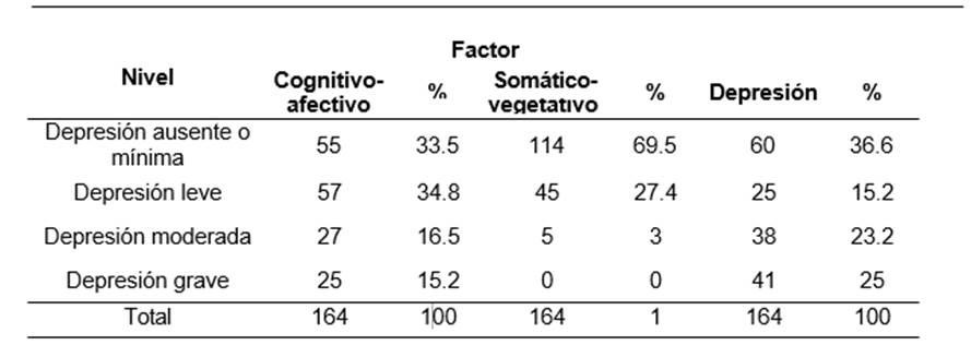 En la tabla 2, existe mayor prevalencia de la depresión grave (25%) y su factor Cognitivo- Afectivo.