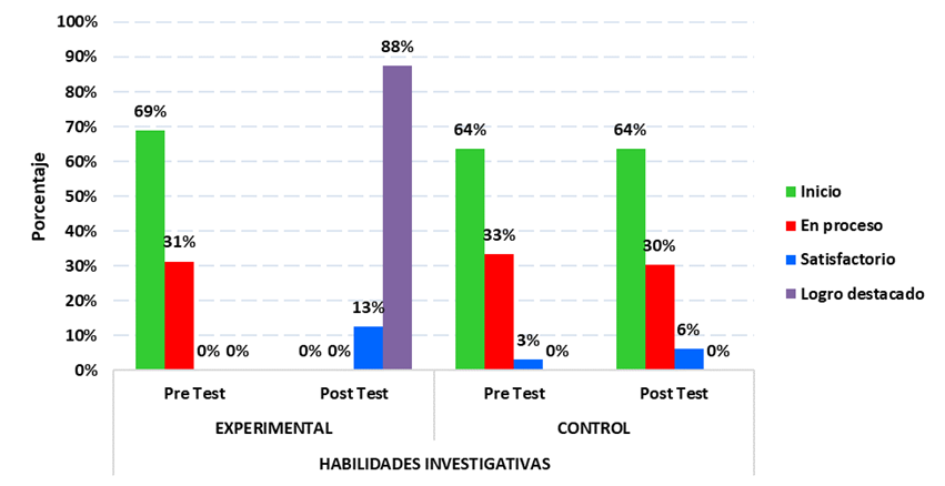Las habilidades investigativas del grupo experimental en la prueba (pre test), se ubicaron en el nivel de inicio (69%), seguido del logro en proceso (31%) y, en el post test, se ubicaron en el logro destacado (88%), seguido del logro satisfactorio (12%) (Tabla 1). Respecto al grupo control en la prueba (pre test) se ubicaron en el nivel de inicio (64%), seguido del nivel en proceso (33%) y en el post test siguieron obteniendo nivel de inicio (64%), seguido del nivel en proceso (30%) (Tabla 1). Una estrategia que se ha desarrollado en las instituciones educativas del nivel superior son los grupos de investigación, que son espacios de encuentro para la formación en metodologías de investigación en el campo profesional del estudiante y del docente. La investigación no puede considerarse una cuestión de profesores o de ciertos campos de conocimiento, sino que debe haber una práctica habitual de desarrollo de las capacidades investigativas en las competencias de aprendizaje de estudiantes de secundaria, a fin de familiarizarlos con el campo científico desde niveles educativos iniciales.