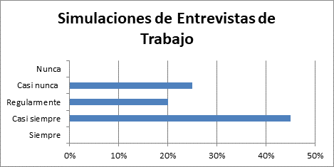 La figura 2 señala que el 45% de las actividades de role play casi siempre se centraban en la práctica de entrevistas de trabajo, regularmente en un 20% y casi nunca en un 35%, lo que sugiere una considerable orientación hacia la preparación para el mundo laboral. Sin embargo, aún se requiere incrementar su frecuencia para superar los indicadores: regularmente y casi nunca.