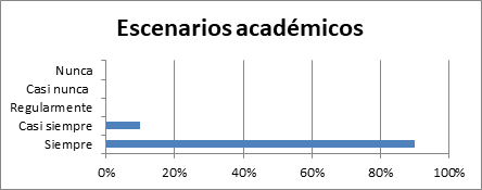 Sustentados en la figura 3, se puede percibir que el 90% de los estudiantes siempre se basaba en escenarios académicos, tales como: debates sobre temas de actualidad, presentaciones orales de proyectos y discusiones en grupo; mientras que el 10% se fundamentaba casi siempre en estos temas, lo que indica una consideración frecuente de tópicos variados favorables para mejorar su expresión oral.