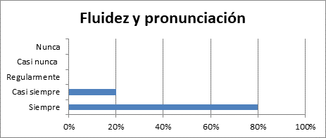 La figura 4, muestra que todos los encuestados opinaron favorablemente a favor de los criterios de fluidez y pronunciación. Específicamente, 80% de los docentes y estudiantes expusieron que siempre el role play ayudó a desarrollar la fluidez y la pronunciación; por otro lado, 20% expresó que casi siempre. En este caso, los participantes del estudio argumentaron que cada simulación les permitió expresarse con espontaneidad y mejor dicción, por cuanto atendían a las correcciones hechas por sus docentes y las aplicaban para las siguientes oportunidades interactivas; de este modo, cada día iban mejorando su habilidad para el habla y, a medida que avanzaban, se desempeñaban óptimamente.