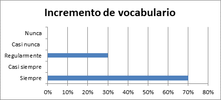 En correspondencia con la figura 5, 70% de los docentes y estudiantes consideraron que siempre se pudo obtener vocabulario en las creaciones y representaciones de role play; por su parte, 30% opinó que regularmente, por cuanto expusieron que muchos de los guiones del role play se elaboraban con vocabulario recientemente aprendido.