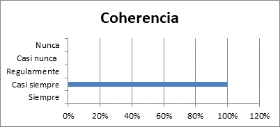 La figura 6 indica que la coherencia fue un factor primordial. El 100% de los estudiantes demostraron emitir ideas de forma entendible, lo cual permitió al otro participante responder fácilmente lo dicho por su compañero en el idioma inglés. Este resultado supone una realidad positiva, puesto que tanto docentes como estudiantes sintieron armonía en las interacciones de los juegos de roles representados. En concordancia, cabe citar a Dosso (2009) que define el role play como “una actividad en la que los ¨jugadores¨, en un proceso de simulación, representan a actores de la realidad, constituyendo un conjunto de individuos que operan por empatía con la ¨otredad¨, es decir, se ponen en la situación del ¨otro¨.” (p. 15)