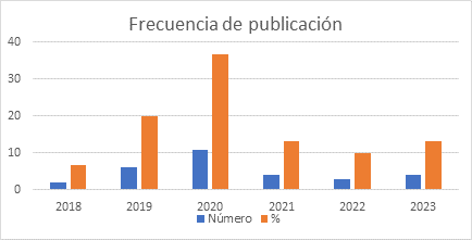 Acorde con los datos de la frecuencia de publicación por años, fue posible observar que los años 2019 y 2020 mostraron mayor porcentaje de producción científica, representando cada uno de ellos 20% y 36.66% respectivamente de los documentos seleccionados para el estudio. A estos les siguen los años 2021 y 2023 con un 13.33% cada uno; en cambio, el 2018 y el 2022 mostraron la menor cantidad de artículos publicados tal como lo muestra la figura 2.