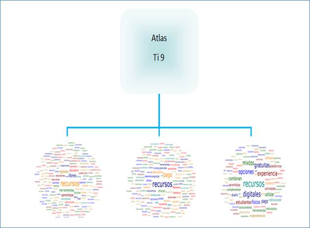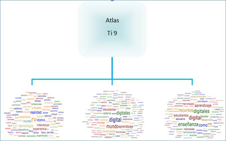 Figura 1. Subcategorías conceptos realidad digital, mundo digital, enseñanza digital. Procesamiento Atlas Ti 9.