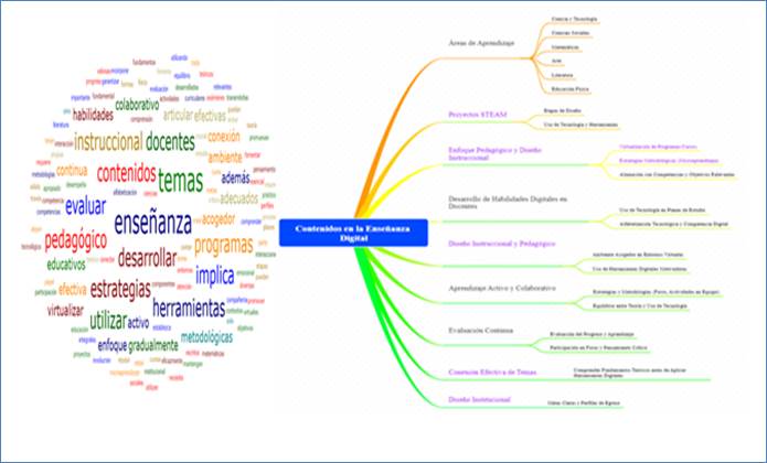 Para dar respuesta a la importancia de seleccionar contenidos educativos según las necesidades del estudiante, en la figura 3 se tiene como resultado que: los contenidos educativos en la enseñanza digital abarcan diversas áreas de aprendizaje, como la ciencia y la tecnología, las ciencias sociales, las matemáticas, el arte, la literatura y la educación física. Estos contenidos se pueden desarrollar a través de proyectos STEAM, que involucran etapas de diseño y utilizan la tecnología y herramientas propias de cada curso. Estos resultados presentan la teoría emergente Contenido Ampliado, que puede ser comprendido como aquel que propone una innovadora y holística metodología educativa centrada en la integración de contenidos de múltiples áreas de aprendizaje, potenciada por la aplicación de la tecnología y enmarcada en un enfoque STEAM+ (Ciencia, Tecnología, Ingeniería, Arte, Matemáticas y disciplinas sociales ampliadas). Asimismo, esta teoría busca empoderar a docentes y estudiantes para que adquieran habilidades digitales y competencias que les permitan enfrentar los desafíos de esta nueva era digital, desarrollando un aprendizaje significativo, colaborativo y crítico.
