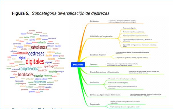 Los resultados obtenidos en la figura 5 afirman que la adquisición y desarrollo de habilidades digitales y destrezas para lidiar con dificultades digitales se basan en una serie de elementos fundamentales que incluyen competencias digitales, resolución de problemas, autonomía, aprendizaje adaptativo, pensamiento crítico, comunicación efectiva, colaboración, fluidez en la información, capacidad de investigación, toma de decisiones y ciudadanía digital. Además, en el contexto del nivel superior, este supuesto sostiene que es fundamental formar a los estudiantes para que utilicen eficientemente las herramientas tecnológicas, comprendan su significado y sean capaces de plantear propuestas creativas. Asimismo, los profesores desempeñan un papel crucial como guías y exploradores de entornos virtuales, proporcionando recursos digitales de calidad para afianzar la adquisición de nuevos aprendizajes para los educandos.