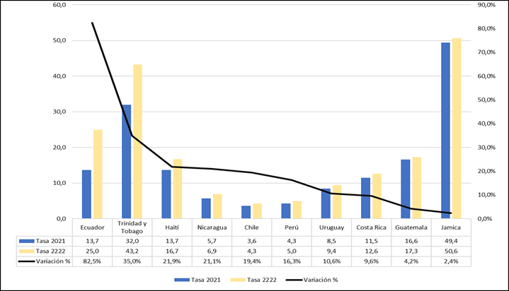 Figura 1. Posición que ocupa Ecuador entre los países con mayor crecimiento de la tasa de violencia en Latinoamérica, 2022.