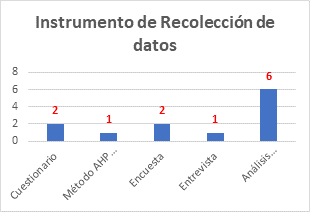 En cuanto a los instrumentos de recolección de datos, se aprecia una diferencia significativa, como se muestra en la Figura 4: seis (6) de las investigaciones utilizaron el análisis documental como método principal. Posteriormente, se observa una distribución equitativa entre el uso de cuestionarios y encuestas, donde dos (2) investigaciones optaron por cuestionarios, aplicados a la población y a hogares respectivamente, mientras que otras dos (2) utilizaron encuestas, dirigidas a viviendas y a la población. Además, se implementó un (1) instrumento de tipo entrevista, dirigido a vendedores y funcionarios. Finalmente, se aplicó un (1) método AHP integrado con GIS, mostrando la diversidad de enfoques en la recolección de datos dentro de la investigación.