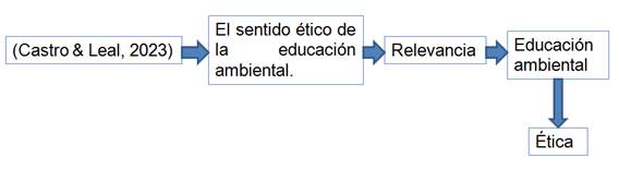 La figura 3, representa el estudio de Castro y Leal (2023) titulado: ¿Educación ambiental o educación para el desarrollo sostenible? El sentido ético de la educación ambiental, el cual se fundamentó en la relevancia de la educación ambiental en las instituciones escolares, tomando como base la ética para la sostenibilidad ecológica. En atención a este estudio, se puede afirmar que todos debemos actuar bajo la ética, a fin de lograr el cuidado del ambiente de forma apropiada y en atención a las normas expuestas por cada país.