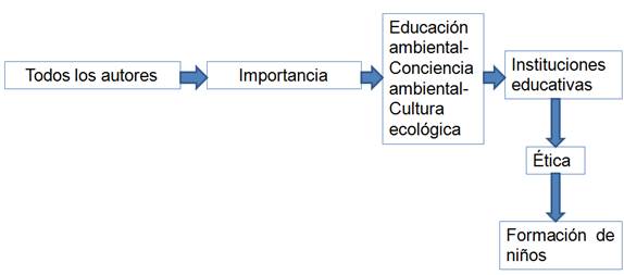 Desde esta perspectiva, en la figura 4, se visualiza cómo estos autores resaltan la importancia de la educación ambiental, la conciencia ambiental y la cultura ecológica, a su vez, dentro de la formación de los niños bajo la ética, las cuales tienen un propósito en común: aportar un grano de arena para la preservación del ambiente a nivel mundial.