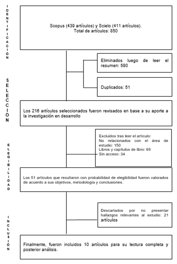 En relación con las fuentes de información, se utilizaron las bases de datos de Scopus, y Scielo, en las cuales se realizaron búsquedas avanzadas con los descriptores: Educación virtual y Educación universitaria; así como los términos en los títulos, resúmenes y palabras clave: Educación virtual, Universidad, Docente y Pospandemia. Una vez obtenidos los resultados de la búsqueda en las diferentes bases de datos, se procedió a la aplicación de los criterios de inclusión y exclusión, a través de las fases de identificación, selección, elegibilidad e inclusión, donde fueron seleccionados inicialmente por títulos relacionables, luego por lectura de resúmenes, metodología, resultados y conclusiones, para ser finalmente, seleccionados los que generaron un aporte sobre los métodos e implicaciones de la educación virtual universitaria.
