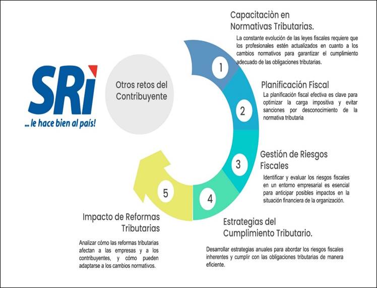 La ausencia de educación tributaria entre los contribuyentes conlleva riesgos para la viabilidad de sus empresas a largo plazo. La incorrecta gestión de las obligaciones fiscales puede resultar en multas, recargos e incluso el cierre definitivo de las empresas, por lo tanto, se requiere una mayor concientización sobre la importancia de la educación tributaria y la necesidad de adquirir conocimientos y habilidades en la gestión fiscal (Muñoz Ávila y Lucio Pillasagua, 2023). Con estos antecedentes, los profesionales y empresas se enfrentan a desafíos significativos, como se detalla en el estudio de Abad et al. (2023):