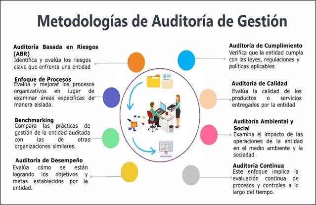 En la auditoría de gestión en el sector público, se emplean diversas metodologías que abarcan áreas que van desde la revisión de procesos y controles internos hasta la medición del desempeño y la evaluación de riesgos (Figura 1). Estos enfoques tienen como objetivo garantizar que los recursos públicos se utilicen de manera eficiente, que los programas y proyectos se ejecuten con efectividad, y que las entidades gubernamentales cumplan con sus responsabilidades de manera ética y legal.