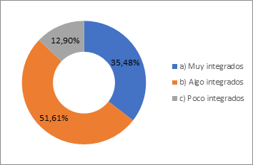 Integración de sistemas: el 35.49% de los encuestados considera que los sistemas de gestión de riesgos y contabilidad en su cooperativa están muy integrados, el 51.61% los percibe como algo integrados, y 12.90%, los califica como poco integrados (Figura 3). Las respuestas reflejan que la mayoría de los contadores de COAC encuestados ven un nivel razonable de integración entre los sistemas de gestión de riesgos y contabilidad en sus cooperativas.