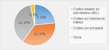Sistema de asignación de costos: el análisis de la encuesta indica que el sistema de asignación de costos más utilizado en las empresas es el costeo por órdenes de trabajo y el costeo por procesos, ambos con un 36.67% de frecuencia, seguidos por el costeo basado en actividades (ABC) con un 23.33%. Solo el 3.33% de las empresas utiliza otros métodos. El costeo por órdenes de trabajo y por procesos son los enfoques preferidos para asignar costos en la mayoría de las empresas, indicando una distribución equitativa entre estos dos métodos. El uso combinado de múltiples sistemas de asignación de costos puede reflejar la diversidad de estructuras empresariales y necesidades de gestión de costos en el mercado (Figura 1).