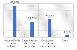 Desafíos: las empresas encuestadas consideran que el desafío más grande en la contabilidad de costos es la asignación de costos indirectos, con un 46.67% de las respuestas. Le sigue la determinación de costos estándar, con un 23.33%, y el control de costos de mano de obra, con un 26.67%. Solo un pequeño porcentaje, del 3.33%, menciona otros desafíos (Figura 2). Con los resultados se demuestra la complejidad que enfrentan las empresas en la contabilidad de costos, de forma especial en lo que respecta a la asignación de costos indirectos.