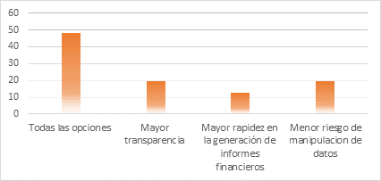 Gestión de la información financiera: la adopción de blockchain en empresas del sector comercial de productos de consumo masivo se espera que tenga un impacto relevante en la gestión de la información financiera. Un 48.30% de los encuestados considera que todas las opciones mencionadas serían beneficiosas. Además, el 19.40% destaca tanto la mayor transparencia como el menor riesgo de manipulación de datos, mientras que otro 12.90% señala la mayor rapidez en la generación de informes financieros (Figura 2). Los resultados indican una percepción generalizada de que la implementación de blockchain tendría múltiples beneficios en la gestión de la información financiera.