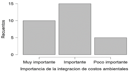 Importancia de la integración: en el sector camaronero, la integración de costos ambientales se percibe como una prioridad relevante según los resultados de la encuesta (Figura 2). Un tercio de los encuestados 33.33% la considera muy importante, mientras que el 50% la valora como importante, 16.67% piensa que esta integración es de poca importancia. Estos porcentajes resaltan la necesidad de fomentar una mayor conciencia y compromiso con la gestión ambiental, con el objetivo de promover prácticas más sostenibles y mitigar el impacto ambiental asociado a esta actividad.