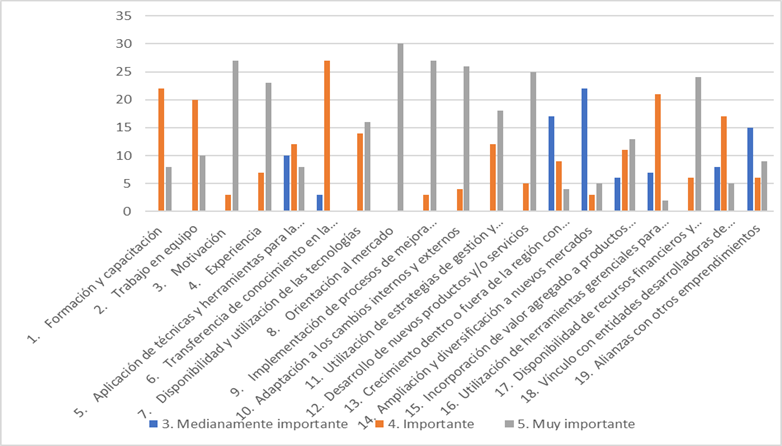 · Las variables mejor evaluadas con el criterio de muy importante fueron: Motivación (27), experiencia (23), orientación al mercado (30), implementación de procesos de mejora continua en productos o servicios (27), adaptación a los cambios internos y externos (26), desarrollo de nuevos productos y/o servicios (25) y disponibilidad y optimización de recursos financieros y materiales (24).