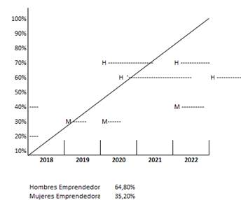 Figura 1. Evolución de intenciones emprendedoras según sexo en la ciudad de Barranquilla (2018-2022).