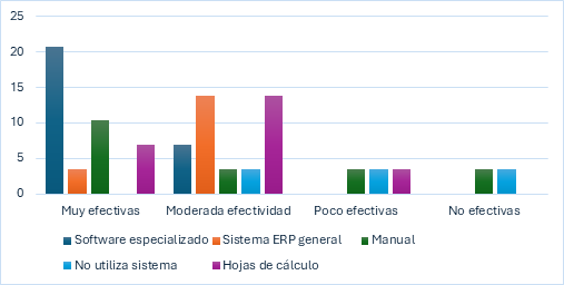 Efectividad de las herramientas en la reducción de desperdicios y reprocesos: el uso de un sistema ERP es valorado de forma positiva por 17.24% de las empresas, donde 3.45% lo percibe como muy efectivo y 13.79% como útil de forma moderada. En contraste, el 20.69% de las empresas llevan la contabilidad de costos de forma manual, de las cuales 3.45% lo consideran efectivo, mientras que 6.90% lo califican como poco o nada útil para la detección y gestión de desperdicios y reprocesos. A pesar de estar en la era digital, 24.14% de las empresas emplean hojas de cálculo, con opiniones divididas debido a los costos asociados con la implementación de software especializado. Por otro lado, 27.59% utiliza herramientas tecnológicas avanzadas, como software especializado, de las cuales 20.69% las consideran muy efectivas y 6.90% útiles moderadas. Para finalizar, el 10.34% de las empresas no utilizan ningún sistema, lo que puede limitar su eficiencia en la gestión de costos (ver figura 1).