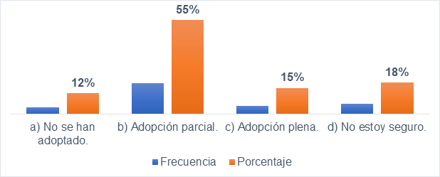 Nivel de adopción de las NICSP: la figura 2, muestra la adopción de las NICSP en los gobiernos locales de la Provincia de Sucumbíos, el 12% de los encuestados aún no han adoptado las normas, mientras que el 55% ha realizado una adopción parcial, indicando que han comenzado a implementarlas y que aún no las han integrado completamente. Un 15% ha logrado una adopción plena de las NICSP, lo que refleja un nivel más avanzado de cumplimiento. Un 18% no está seguro sobre el nivel de adopción en su gobierno local, lo que ocasiona una falta de claridad o comunicación al respecto.