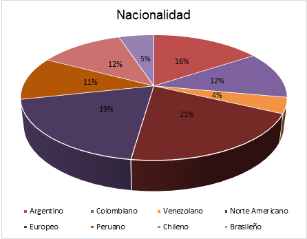 Asimismo, se puede observar diferentes tipos de nacionalidades que visitan la provincia para realizar turismo, tomando en cuenta que el porcentaje mayor con un 21% son turistas Norte Americanos dándonos posteriormente apertura con un 19% los turistas Europeos, seguidos de los Argentinos con un 16%.