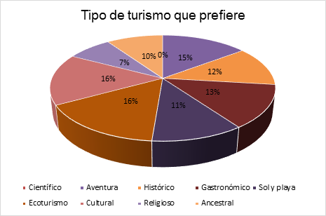 Posteriormente al momento de realizar un viaje el turista prefiere incursionar en el turismo cultural y ecoturismo en un 16% y el turismo de aventura en un 15% siendo estos los de mayor porcentaje en el análisis presentado.
