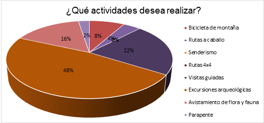 Al momento de planificar un viaje el turista considera realizar ciertas actividades de turismo durante su viaje, por lo que se a analizado que las preferencias dentro de las actividades que más les gusta desarrollar a los turistas son las excursiones arqueológicas con un 48% y las visitas guiadas con un 22%
